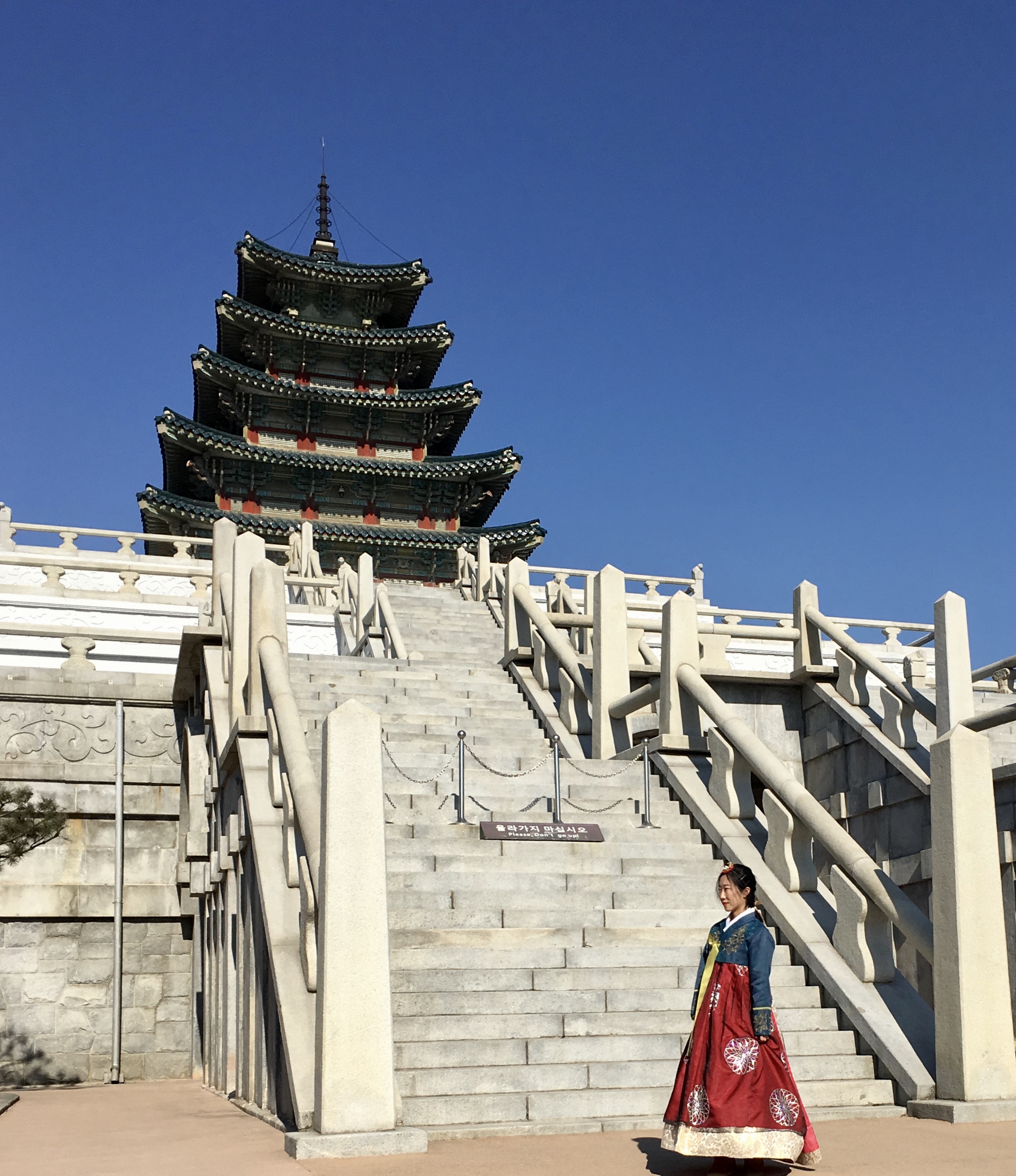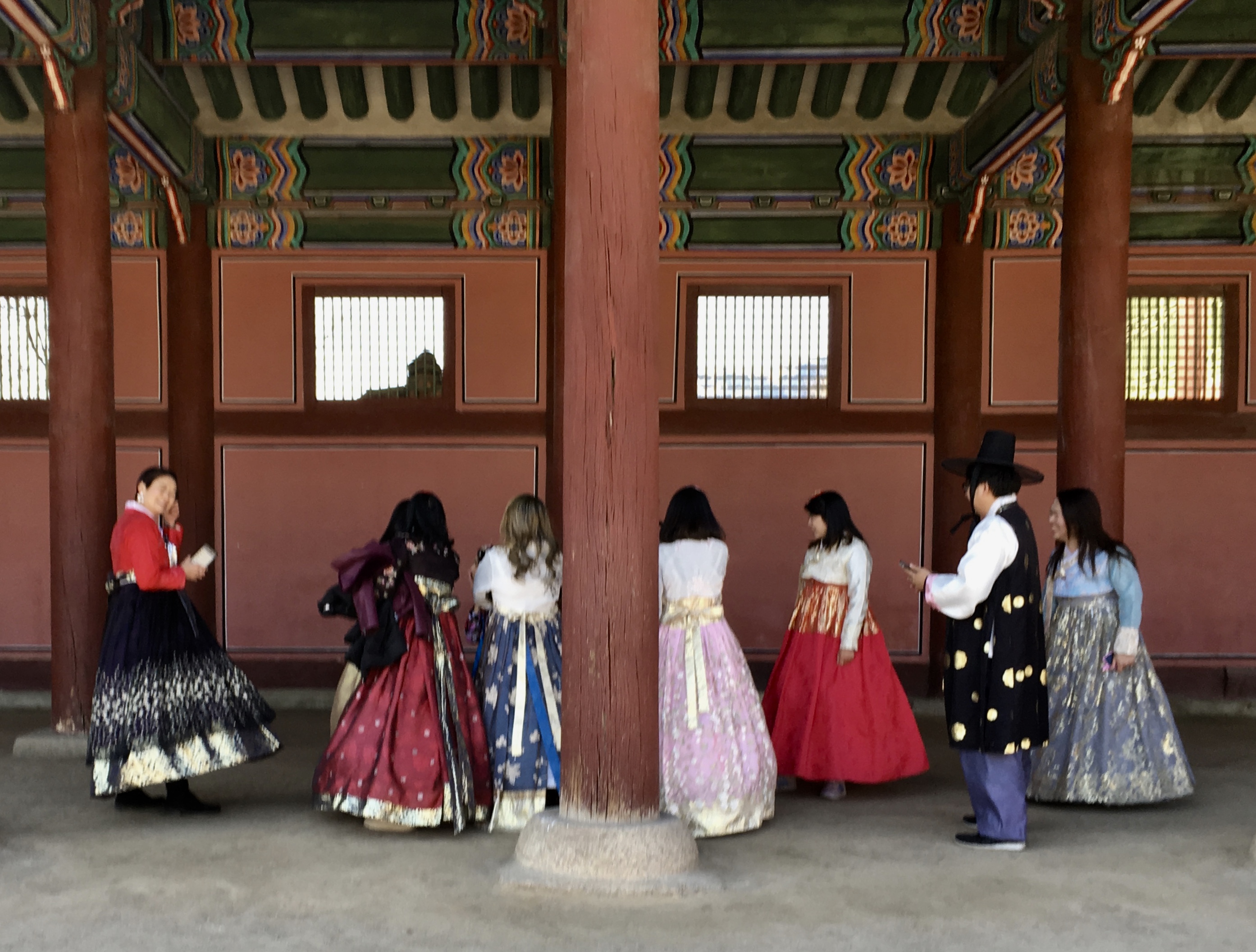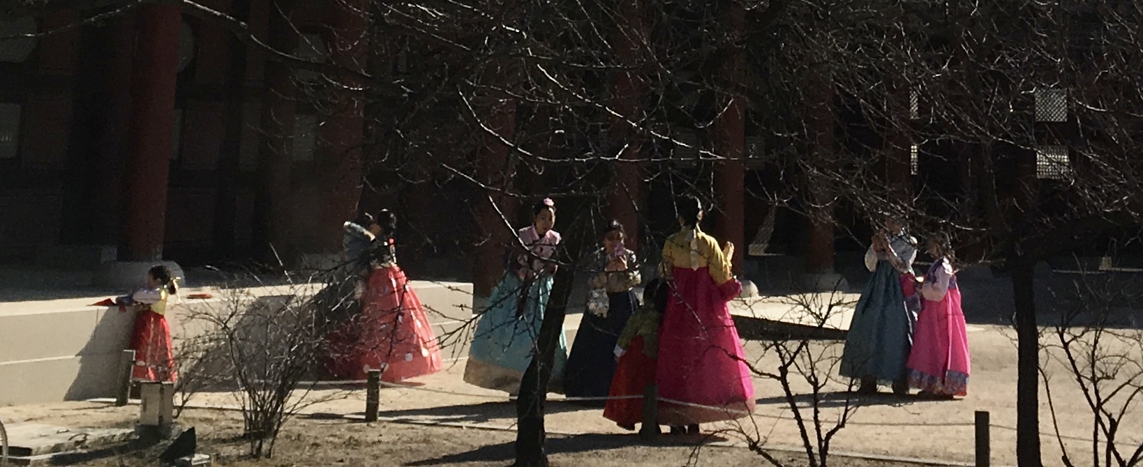 A lot of folks were out on this beautiful day, many of them in rented Hanbok traditional clothing. Rascal that I am I approached a mom and her teenage son, who wore Hanbok. I deeply bowed in front of him and said “His Majesty” in Korean. The mom had a laughing fit. Next I wanted to try that with one of the many young ladies wearing Hanbok, this time saying Kongju Mama, which means Her Excellency the Princess. So glad I didn’t: 80% were Chinese, the rest a mix of Philippinas, Indians and other Asian nationalities. Korean women only rent Hanbok when they visit traditional Korean villages!