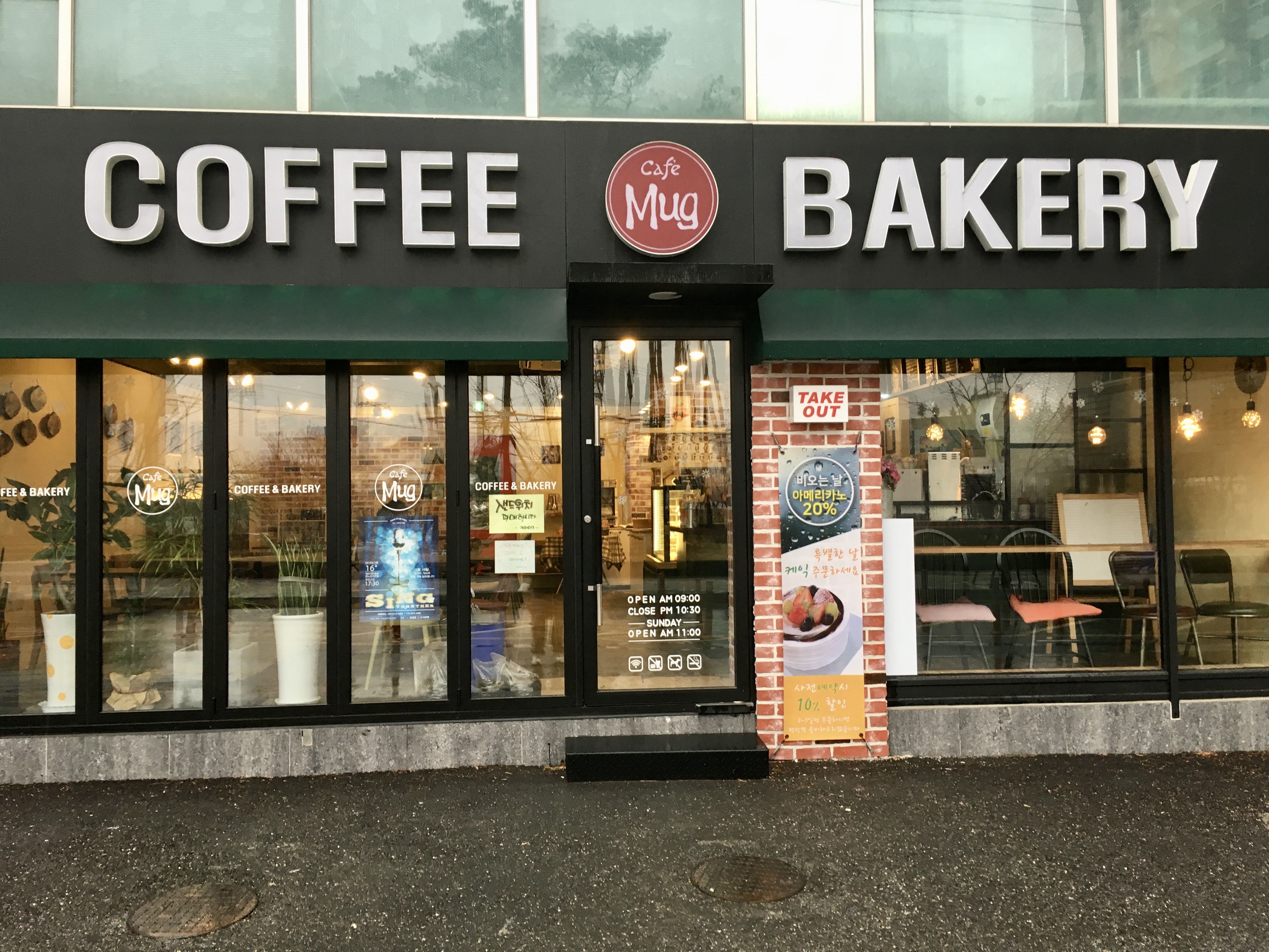 This morning I was looking for my first café in Suwon (a Seoul suburb of 1 million; our former exchange student lives here). Right beside my airbnb I found Mug Coffee & Bakery. The baker is also the owner. Her friendliness and smile are heart-warming! After two lattes and one Earl Grey I ventured out in the rain to explore the area – and yes, of course looking for more cafés that would a) be open during most of the Seollal holiday, and b) open before 10 am. The owner of Mug wanted to lend me an umbrella. I don’t like umbrellas and respectfully declined. And then I got quite wet….and hungry. I returned to Mug, asking if I could have the same bread I saw the owner and her employee eat in the morning. It’s not even on the menu – but yes! Before I could say anything though, she looked at me and brought a towel so I could dry myself. Upon leaving, she was very strict in wanting to give me an umbrella. She only relented when I told her that I stay at the next house. Ah, yeah: I also showed them it was minus 31 Celsius in Whitehorse today! A little rain at plus 4 can’t be that bad. Mug is across from Gate 3 at the Suwon Sports Complex (bus lines 310, 900 and 777 to/from Suwon Station).