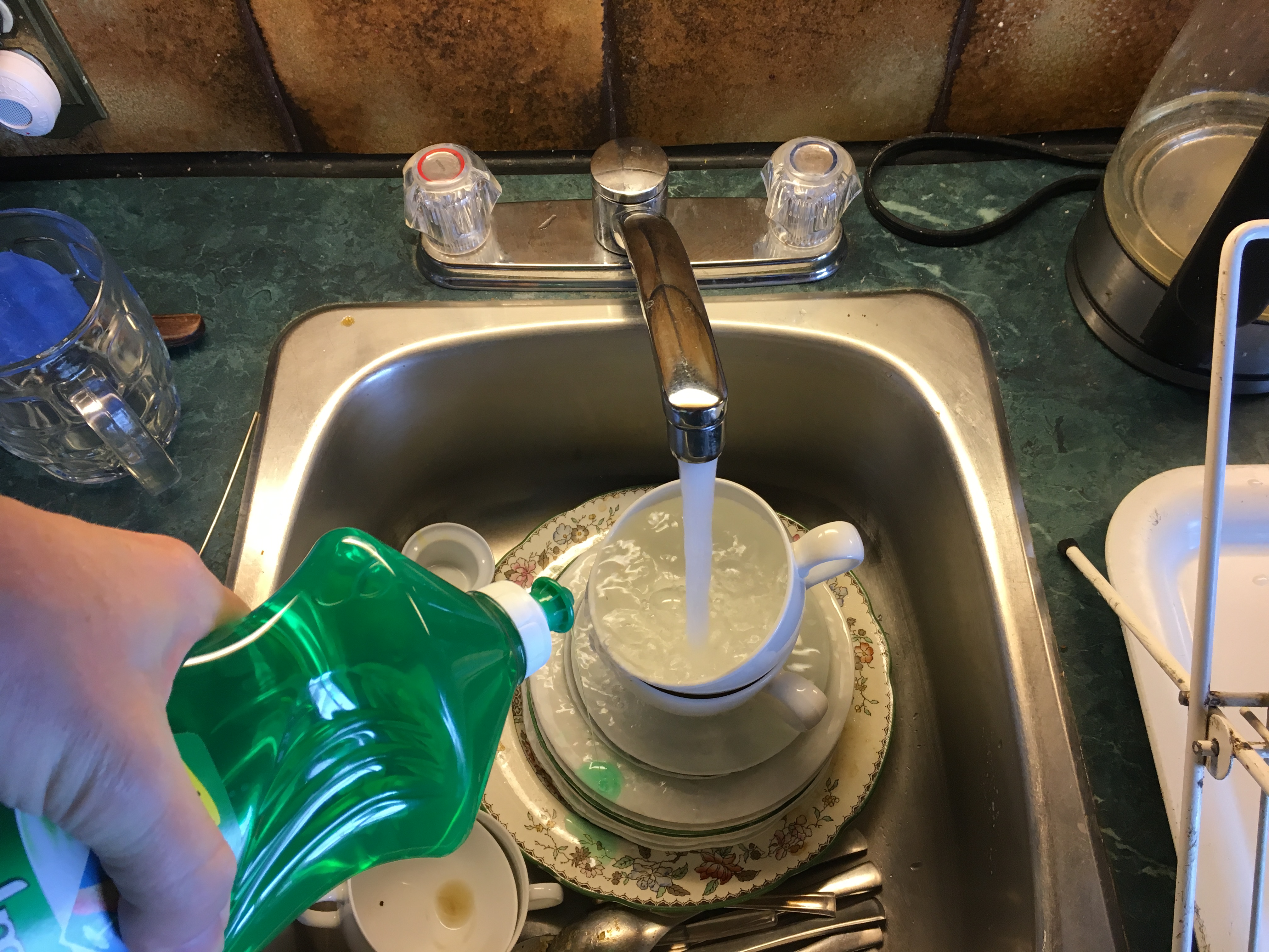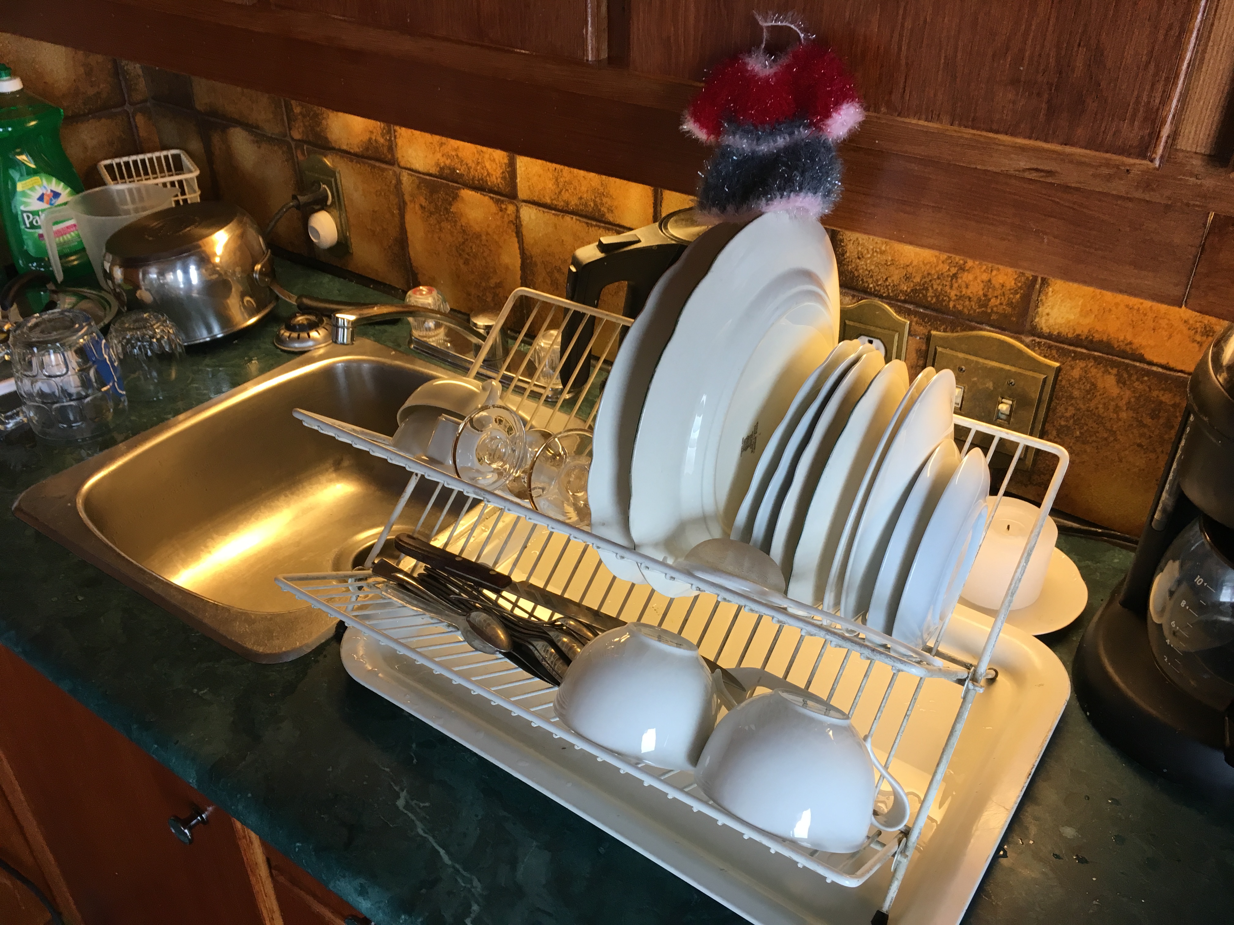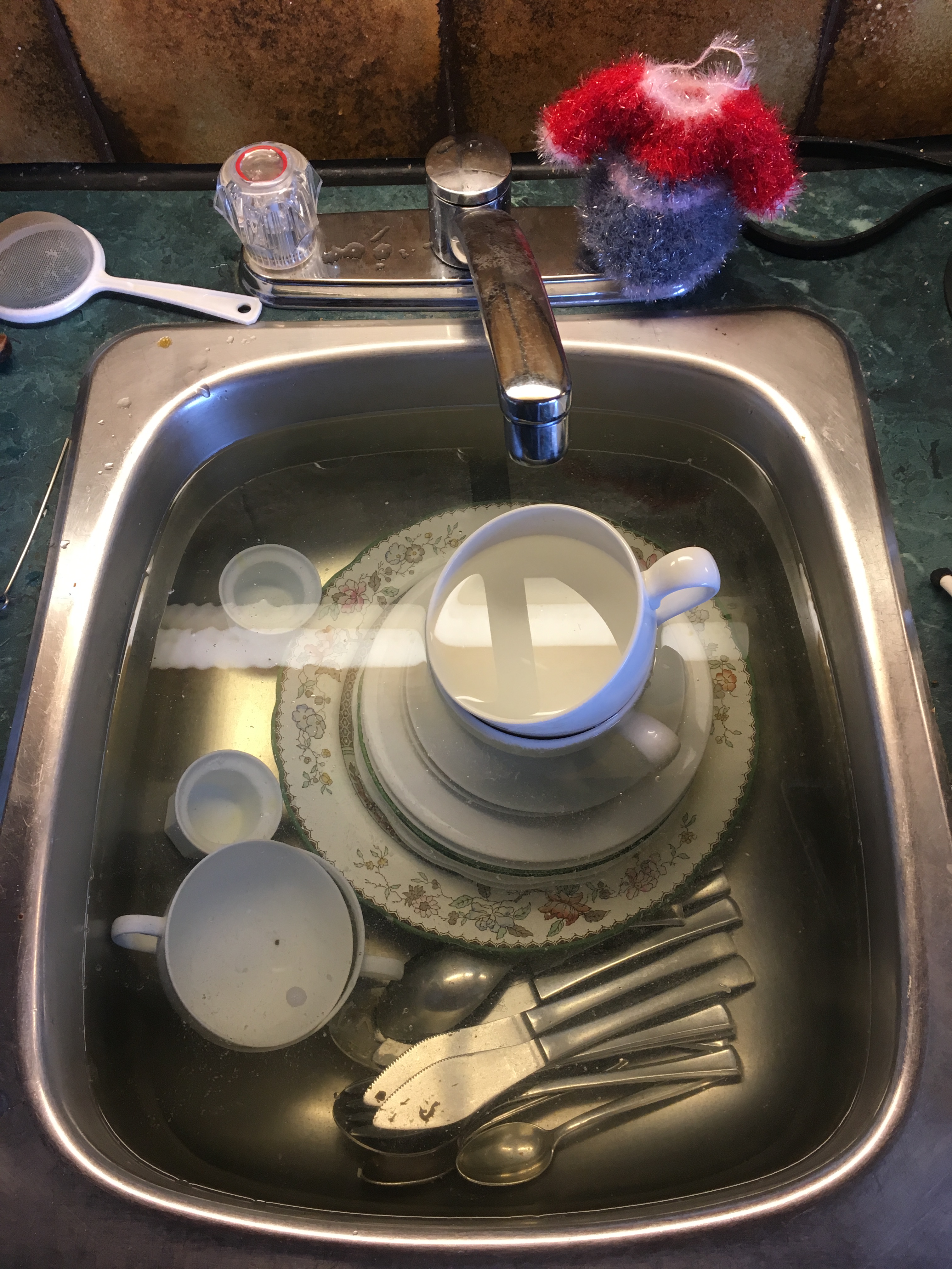 I have complained with many Koreans about how they do the dishes: Under running water, applying soap generously and individually, rinsing each item. My way uses less water and soap, and is a lot faster. Here it is in five easy steps (the little figurine is for dish washing and was a present from a Korean mom who took exception to my complaints :-):