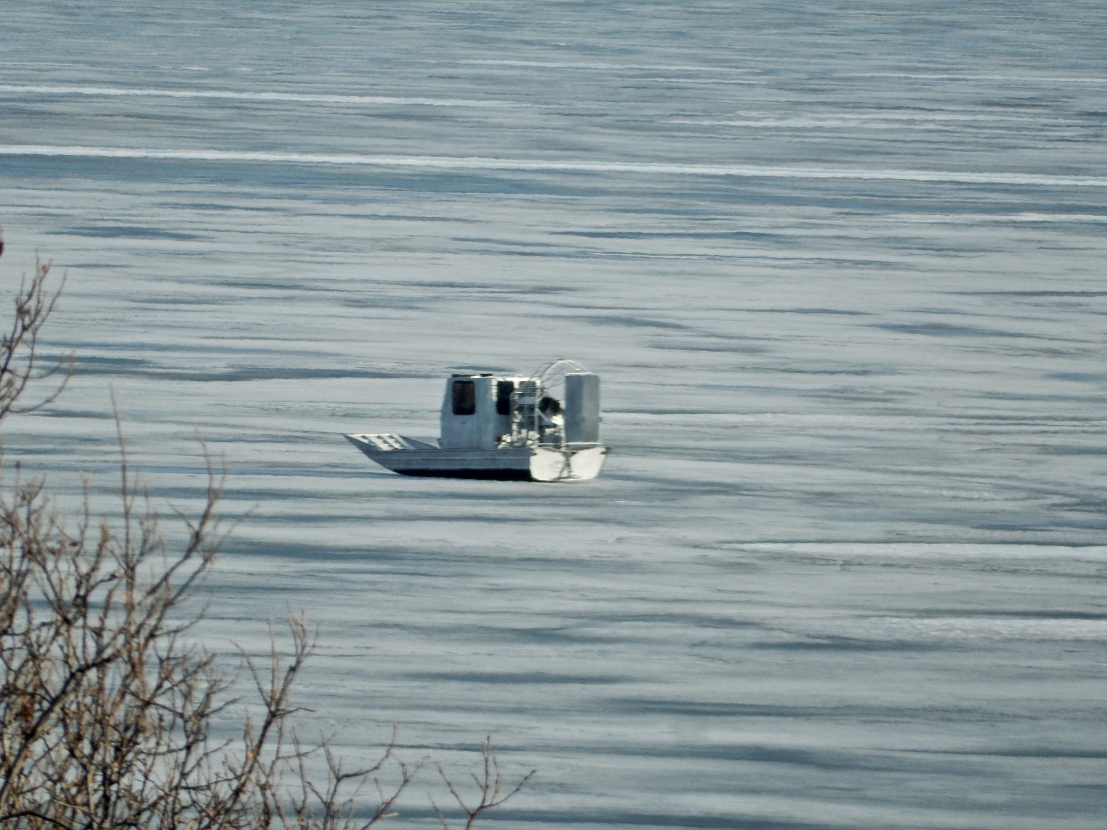 … you don’t want to take any risks. This outfitter is taking out hunters across the Atlin Lake for wolf hunts. His boat is noisy and was designed for swamps, but hey, it works just fine on ice.