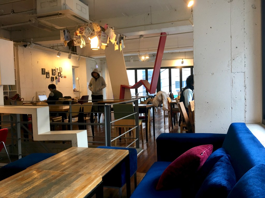Finding a café in Korea that is open before 9:00 am is very difficult. Café Gabie is open 24/7! Maybe that’s no coincidence, being so close to Hongik University, Korea’s leading university for creative professions. Wikipedia writes: “…widely regarded as the best architecture and art school in rivalry with Seoul National University.”