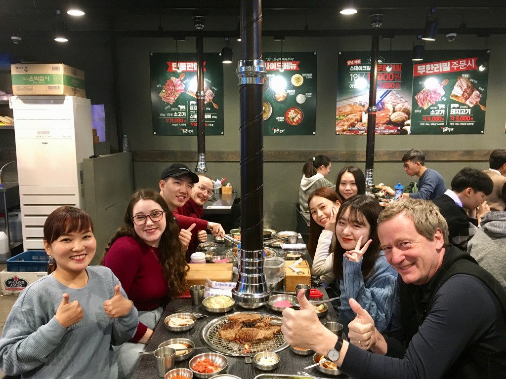What we do and why we’re learning Korean is very diverse: Restaurant manager, studying: International Studies/Agriculture, Psychotherapy, Japanese Society. Plus an Internet entrepreneur, business coach, simultaneous translator English/French into Spanish. Most of us are just interested in Korean society and learn Korean for fun. The internet entrepreneur tried to make me wear the lipstick she’s promoting on the web. I told her that wouldn’t be sitting so well with my reputation as a consultant. She did manage to apply some mascara on my right eye lid – the sparkling kind that was hard to clean off. So much fun! I wouldn’t want to miss a minute with my fellow students. PS: My wife just told me that mascara is applied to eye lashes not eye lids 🙂