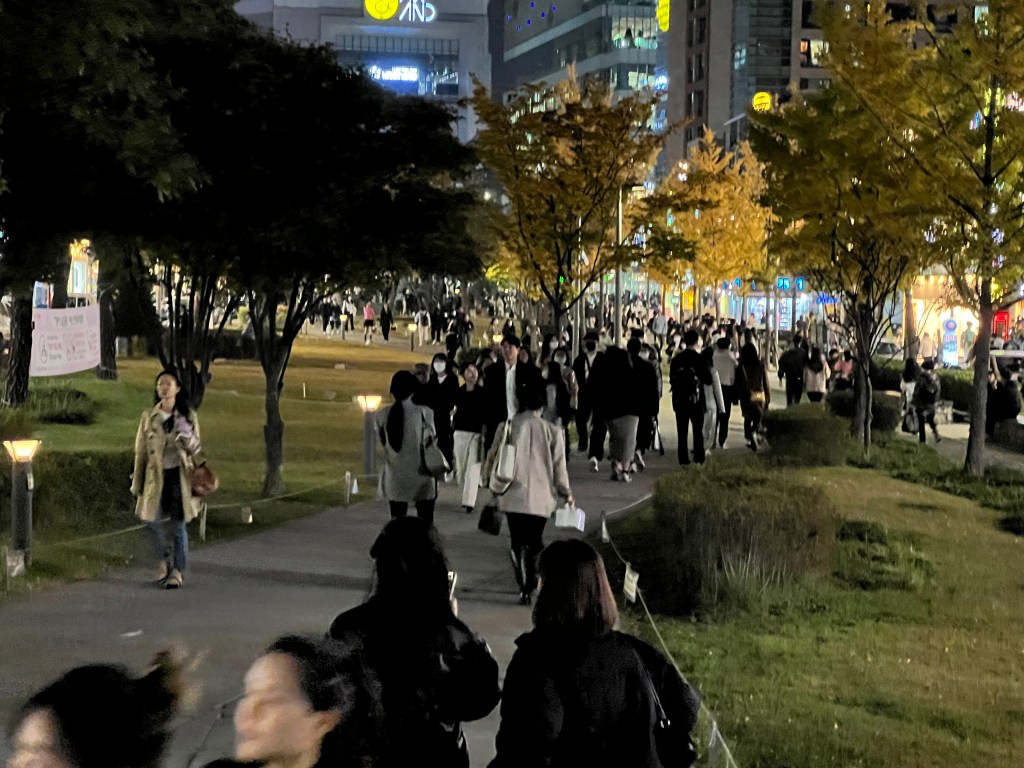 Life as a pedestrian in Seoul has its perils. The delivery riders in particular ride their scooters through red lights, on walkways, against one-way streets, at breathtaking speeds. A friend of ours called them “organ donors”. Once my wife was almost run over by one of them – I pulled her back at the last second. Their reality is quite sinister: They are under enormous time pressure to do their deliveries, on which their (low) income depend. We’ve see some with three smart phones on their handle bar, displaying the next closest delivery missions.