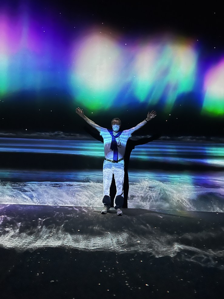The absolute best was a large room fully surrounded by screens and mirrors, in which an amazing array of paintings by world-renowned artists were shown in large format: Klimt, van Gogh, Gaugin etc. We stood on an observation pedestal for half an hour in fascination. What a wonderful combination of old and new. Imagine bringing this art to audiences and places that would have never seen this art before. Imagine the variety of art that can be presented this way. Watch for the people in the next two photos.